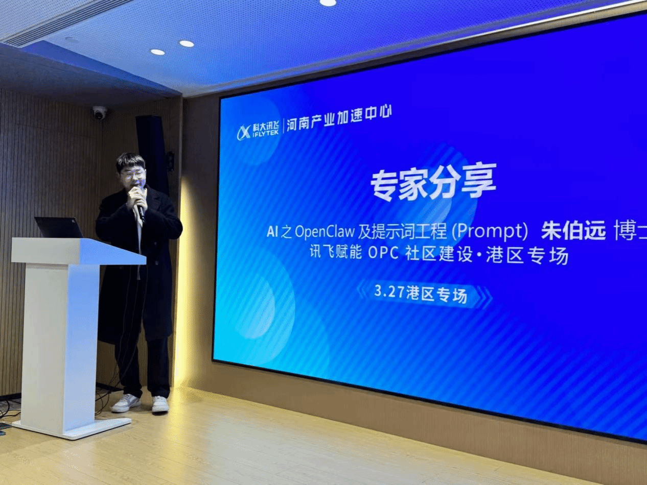 近日,“共创场景,共筑未来——讯飞赋能OPC社区建设·港区专场”活动于科大讯飞河南产业加速中心成功举办。我院青年教师朱伯远博士作为受邀嘉宾,与港区政府代表、科大讯飞技术专家、行业企业家等各界人士齐聚一堂,共同探讨人工智能赋能OPC(One Person Company)社区建设的创新路径与发展蓝图,为港区数字经济高质量发展凝聚智慧力量。